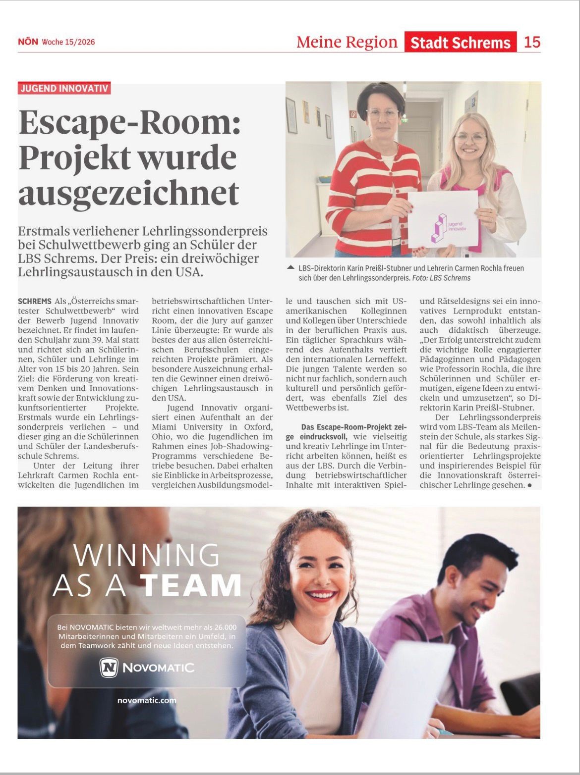 Die Landesberufsschule Schrems wünscht unseren beiden Siegerinnen alles Gute und hält Frau Sorena für die Bundesausscheidung des Jugendredewettbewerbes 2024 ganz fest die Daumen.